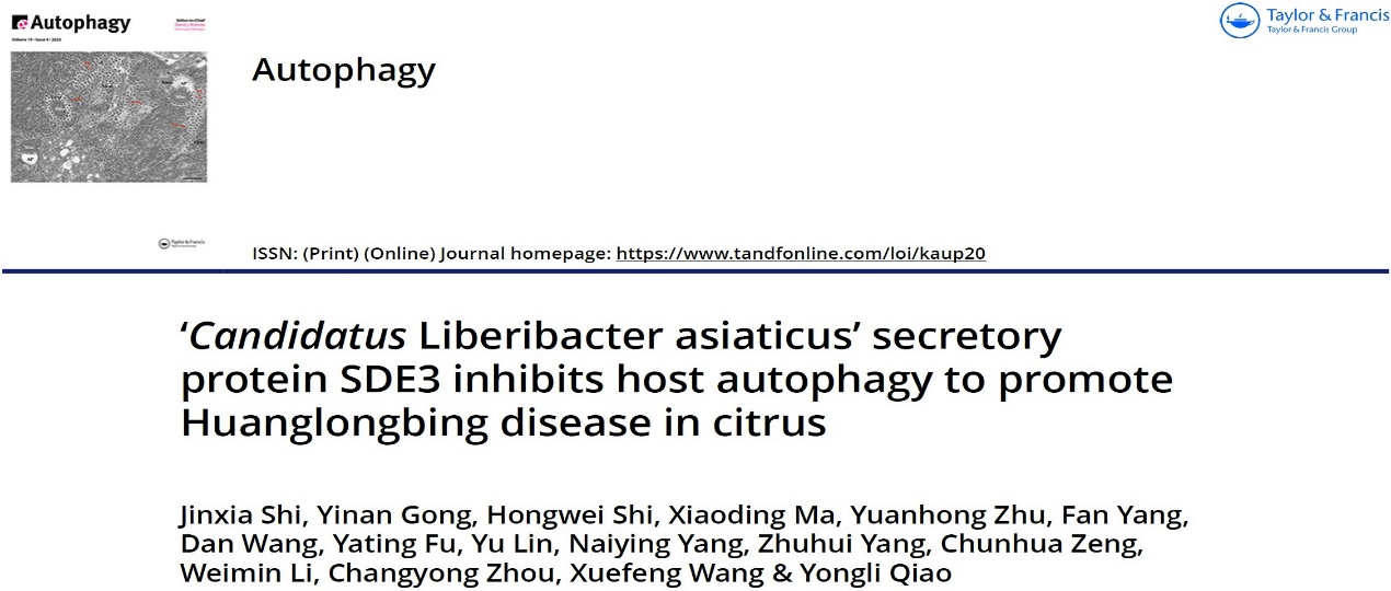 近日,OK138太阳集团乔永利课题组在国际知名学术期刊Autophagy上在线发表题为“Candidatus Liberibacter asiaticus’ secretory protein SDE3 inhibits host autophagy to promote Huanglongbing disease in citrus”的研究论文,该研究揭示了CLas分泌的效应子SDE3通过调控植物自噬抑制柑橘抵御黄龙病的分子机理。