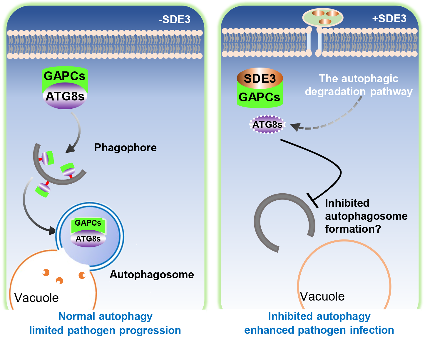 该研究发现黄龙病菌SDE3效应子的表达不仅增强了病毒和疫霉菌对烟草和拟南芥的感染能力,而且显著地增强了柑橘溃疡病和黄龙病的易感性。进一步研究表明SDE3效应子直接与柑橘胞质中3-磷酸甘油醛脱氢酶(CsGAPC1/2)相互作用,抑制植物的自噬。CsGAPC1/2可以与柑橘自噬相关蛋白家族CsATG8s (CsATG8A/C/D/F/G/I)直接互作,并特异性地降解了CsATG8s。感兴趣的是,研究人员发现,SDE3与CsGAPC1/2的互作进一步增强了CsGAPC1/2通过自噬途径对CsATG8s的降解。总的来说,该研究揭示了CLas效应子SDE3通过调控柑橘自噬促进其侵染的分子机制,其结果可为建立柑橘黄龙病新型防控策略提供重要的理论依据。
