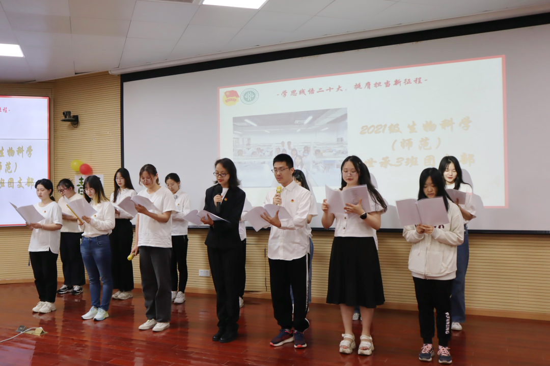 2021级生物科学(师范)专业2班团支部通过情景剧演绎本校首任校长廖世承先生为了救国而选择学习教育的决心与爱国情怀,并且支部成员带来合唱《少年中国说》体现对于未来成为教师的使命与担当的深刻认识,彰显支部活力。