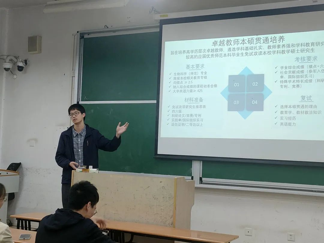 金诚杰同学简要介绍了“本硕贯通”卓越教师培养项目的概况,并详细地从基本要求、考核要求、材料准备和复试四个方面展开介绍了如何获取该资格。他重点讲到了与每个同学都息息相关的绩点、六级成绩以及实践章,鼓励大家多多参与各类竞赛和科研项目,尤其是师范生可以积极参与各类师范生技能竞赛。最后他分享了自己在大学中的学习经验,并对如何应对复试给出了贴心的建议。