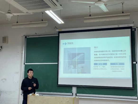 潘顺杰同学从个人经历出发,分享了关于预推免的流程及情况。他清晰地介绍了夏令营与预推免的区别、预推免的基本流程,以及在预推免的各个阶段需要注意的事项。同时,他以自身面试经历作为案例,提醒同学们面试前需要提前准备、关注专业知识,面试时真诚回答。最后,他还鼓励各位同学积极参加科研与竞赛,拓宽视野,增长经验。