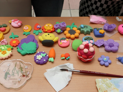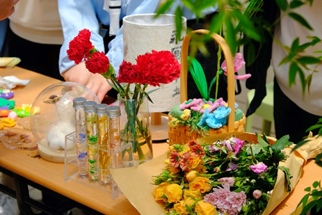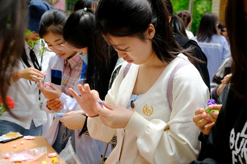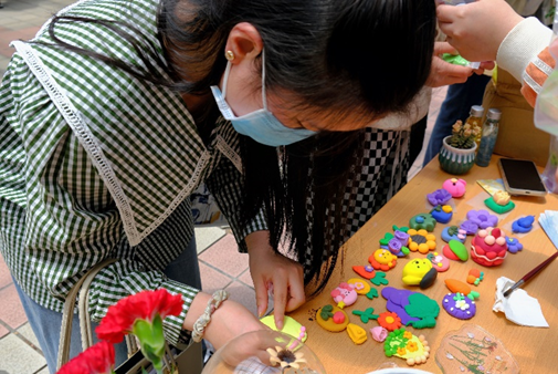 园艺学堂以“植念”为主题,装点盛放的鲜花和永生植物工艺品。一走进摊位便能嗅到扑面而来的植物气息和涌动的生命力,感受植物魅力。同学们纷纷动手,用粘土塑造植物,在指尖盛放绿色生命。在调配植物的颜色中,感受植物色彩的缤纷;在一捏一揉中观察植物的形态,感受植物的形态之美。同学们制作的成品极具特色,有草莓,郁金香,胡萝卜,玫瑰花,蔷薇等等,收获无限乐趣。
