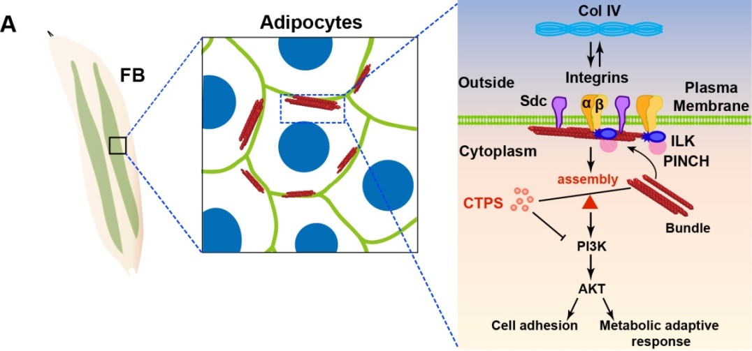 肥胖是全球性流行的代谢疾病,其特征是脂肪堆积过多或异常。肥胖是糖尿病、心血管疾病和癌症等慢性疾病的主要风险因素,每年约有250万人死亡,对健康构成很大威胁。高脂肪饮食(HFD)是导致肥胖的主要因素,了解肥胖及其相关的继发性疾病的机制需要综合考虑遗传因素和过量饮食脂肪摄入的有害影响。然而,遗传易感性、环境和生活方式因素在肥胖病因中的确切相互作用仍有待阐明。面对高脂诱导的肥胖、糖尿病和心血管疾病等代谢性疾病,果蝇以其丰富的遗传工具,生命周期较短的优势成为研究遗传学、饮食和代谢之间联系的一个强大而简化的理想动物模型。作者在前期研究中利用荧光标签敲入果蝇,通过超高分辨显微成像发现脂肪细胞中CTPS作为与胶原蛋白 IV—整合蛋白通路(Collage IV-integrins)相互作用的蛋白分子,通过分子的聚合和解聚,调控粘连蛋白和胶原蛋白在细胞中的分布(图1),在脂肪细胞连接和组织构建中发挥关键的调节功能和作用(Jingnan Liu, et al.,Cellular and Molecular Life Science2022)。脂肪组织是机体调控脂质和能量代谢的重要器官,CTPS是否直接参与脂代谢稳态调节?通过何种下游分子或通路影响细胞稳态?成为亟待回答的重要科学问题。