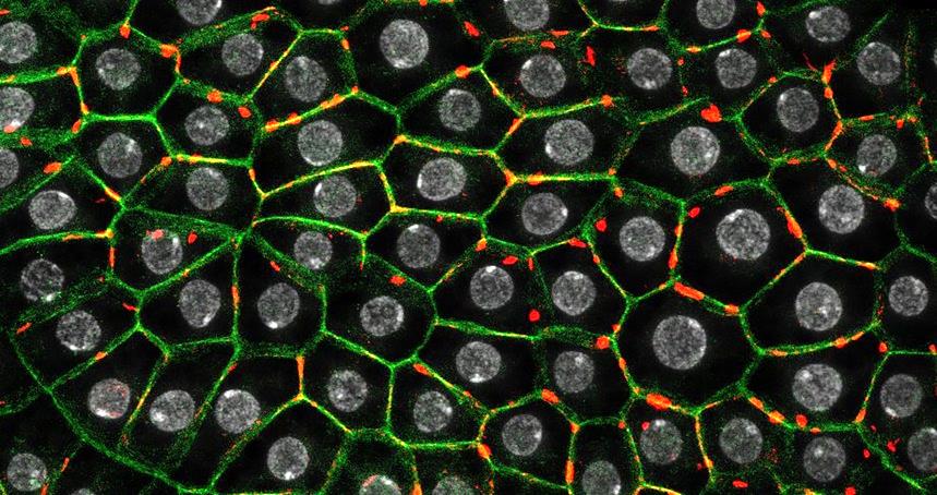 图1. 脂肪细胞中CTPS聚合物紧邻细胞膜分布(CTPS,红色;脂肪细胞,绿色;细胞核,灰白色)