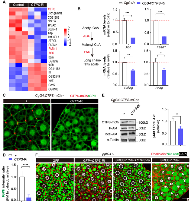 图3. CTPS缺失通过抑制PI3K-AKT-SREBP通路活性抑制脂质合成酶Acc和FASN1的基因表达,从而调节脂质生成和代谢稳态
