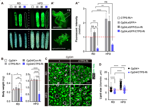 该研究中,作者首先利用UAS/GAL4系统在果蝇成虫神经组织和脂肪组织等重要的代谢组织中,分别特异性地敲低CTPS表达。研究发现CTPS在果蝇脂肪体中参与体重和饥饿耐受的代谢调节。进一步研究发现在高脂饮食下,伴随着果蝇增重和脂质堆积的增加,脂肪体中CTPS表达增强,随之形成的聚合体长度增加,提示CTPS能够通过动态分子组装以响应营养变化。深入研究发现脂肪组织特异敲低CTPS表达能显著降低幼虫体重和脂肪积累,表现为脂肪细胞和细胞核减小,重要的能量存储分子甘油三脂(TAG)含量明显减少(图2)。