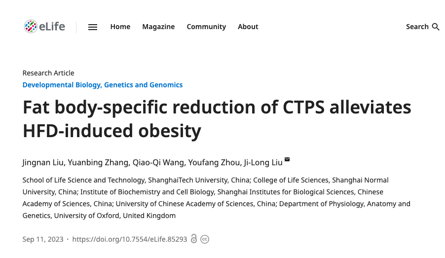 2023年9月11日,OK138太阳集团刘竞男副研究员与上海科技大学刘冀珑团队合作在eLife在线发表了题为“Fat body-specific reduction of CTPS alleviates HFD-induced obesity”的研究论文。同时,该论文被遴选为“eLife digest”特别撰文报道。该研究揭示了脂肪组织中CTP合成酶(CTPS)动态聚合或解聚在脂质生成和脂肪组织发育过程中的重要作用。通过整合PI3K-AKT信号通路,CTPS能感应营养变化并调整代谢适应能力,从而影响脂质合成基因表达,调控脂代谢稳态的生理功能和分子机制。