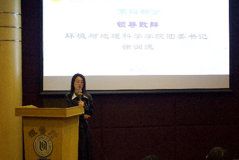 环境与地理科学学院团委书记徐润浇老师为本次结业仪式致辞。首先,徐润浇老师向所有策划并组织培训的工作人员以及团学骨干成员们表示感谢,向顺利结业的全体团学青年们表示祝贺。