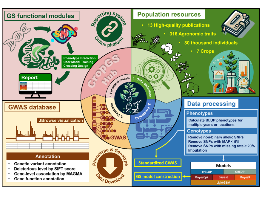 全基因组选择(Genomic Selection)是一种广泛应用的育种技术,可利用基因组信息和构建的GS模型来预测并选择具有目标特征的个体,从而加快育种进程,推动育种向精准化和高效化的方向发展。为了充分利用种质资源并推进作物育种工作,整合作物群体的基因组和表型数据资源以及建立开放的育种数据库和功能平台变得尤为重要。目前已经开发了许多整合作物材料遗传变异和GWAS位点等信息的基因组信息平台;然而,集合作物群体基因组信息和GS分析功能的育种平台却较为稀缺。