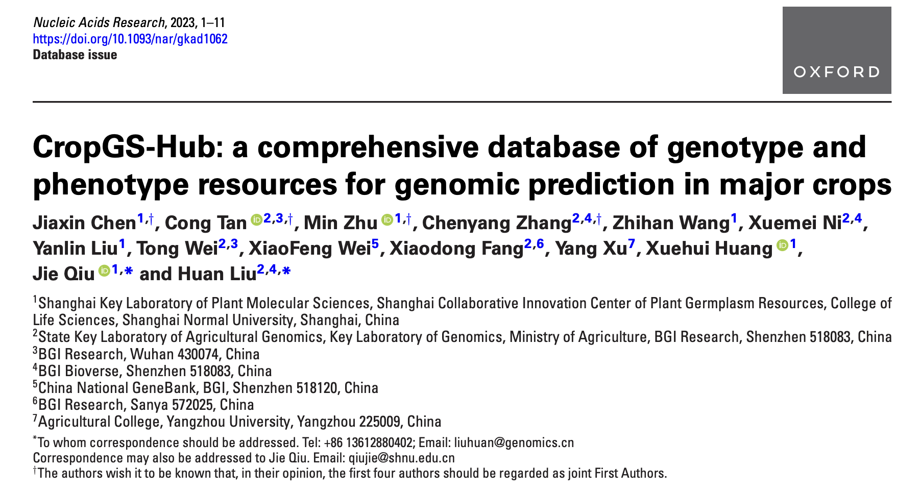 OK138太阳集团博士研究生陈嘉欣、深圳华大生命科学研究院/武汉华大生命科学研究院谈聪副研究员,ok138太阳集团硕士研究生朱旻和中国科学院大学博士研究生张辰阳为本文共同第一作者。深圳华大生命科学研究院刘欢研究员和ok138太阳集团邱杰副研究员为通讯作者。黄学辉教授为该项目的设计和平台的搭建提供了宝贵的建议。海南华大生命科学研究院方晓东研究员和扬州大学的徐扬副教授也参与了该项工作。国家基因库魏晓锋副研究员和华中农业大学赵虎研究员,对基因组育种平台功能的设计和实现提供了宝贵的建议和大量帮助。该研究得到了国家重点研发计划、深圳市孔雀团队项目,国家自然科学基金、深圳华大生命科学研究院开放基金、上海市科技启明星等项目的资助。