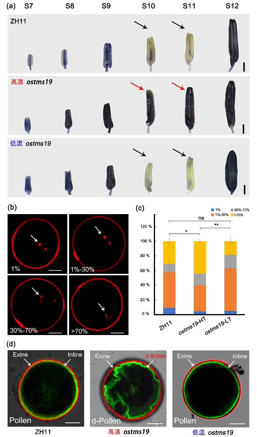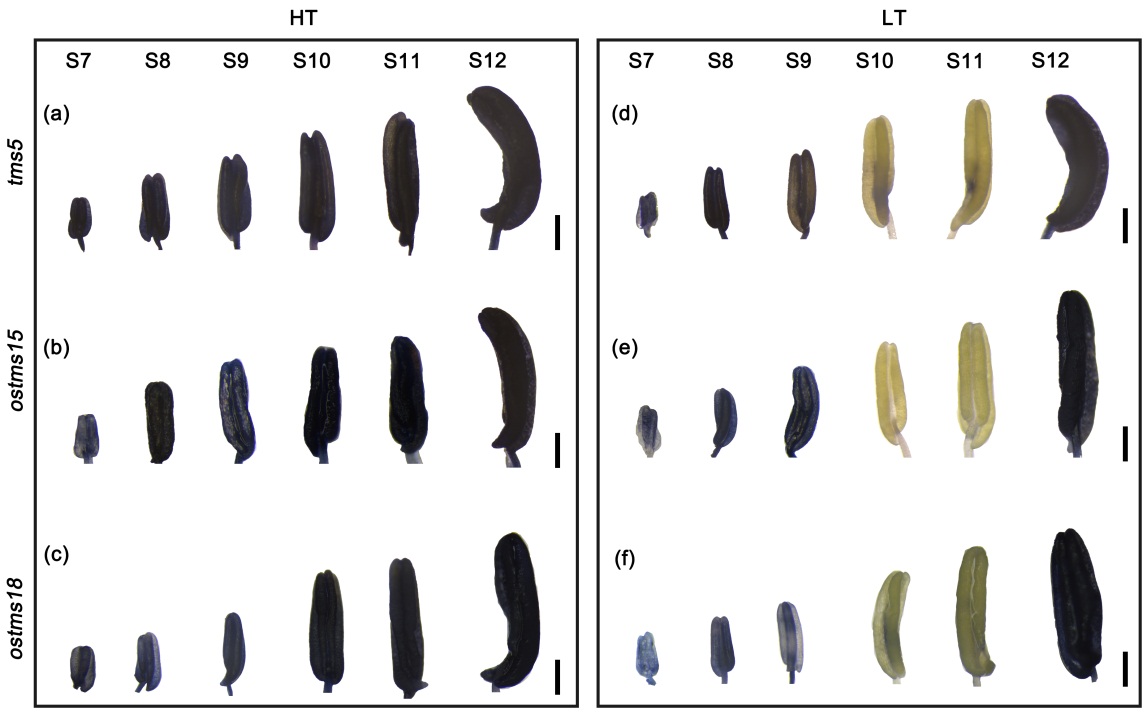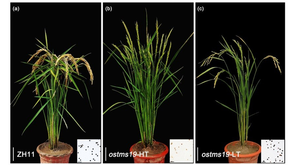 光温敏不育作为一个重要的农艺性状,在水稻两系法杂交制种中发挥关键的作用。尽管在水稻中发现了诸多的光温敏不育位点,但是温度和光照如何影响水稻育性的共性机制尚不清除。课题组在前期工作中利用模式植物拟南芥光温敏不育系的研究,解释了低温下小孢子发育缓慢是植物育性恢复的共性机制(Zhu et al., 2020, Nat Plant 6:360-367; Zhang et al., 2020, Plant Physiol 184: 923-932; Shi et al., 2021, Mol Plant 14:2104-2114; Wang et al.,2021, JIPB 64: 717-730)。但水稻中发现的光温敏位点与拟南芥有很大差异,提示水稻中除了缓慢生长外,还存在其他光温敏不育的共性机制。课题组发明了水稻光温敏不育系的创制技术,获得了一系列中花11(ZH11)为背景的水稻光温敏不育系。在2022年 (Zhang et al., 2022, PBJ 20:2023-2035;ostms18) 和2023年 (Han et al., 2022, PBJ 21:1659-1670;ostms15)发表两个具有直接育种价值水稻光温敏不育系的基础上,本次发表的是ostms19(图1)。