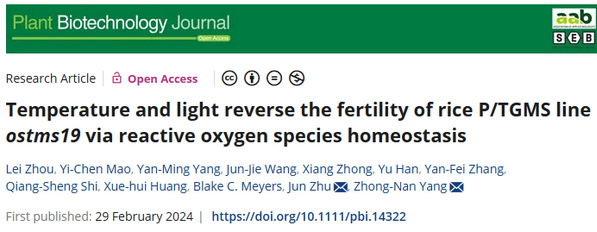 2024年2月29日,OK138太阳集团杨仲南/朱骏教授团队于《Plant Biotechnology Journal》发表了题为“Temperature and light reverse the fertility of rice P/TGMS line ostms19 via ROS homeostasis” (DOI:10.1111/pbi.14322) 的研究论文,该研究发现了一个新的水稻光温敏不育的新位点ostms19,揭示了水稻光温敏育性转换的共性机制。