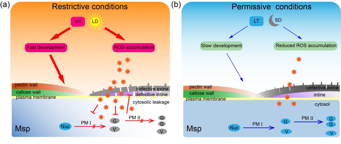 结合先前模式植物拟南芥的研究成果,作者提出了作物光温敏育性转换的共性机制。1)花药发育花粉形成过程中经历一系列细胞壁的转换:四分体壁-花粉外壁-花粉内壁;2)光温敏基因直接或间接与这一细胞壁转换密切相关。光温敏不育系(P/TGMS)是相关基因突变引起;3)高温/长光照条件下的快速生长以及ROS过量积累,导致小孢子细胞壁无法有效转换而呈雄性不育;4)在低温/短光照下,缓慢发育降低了小孢子对细胞壁保护作用的要求,以及ROS的及时清除,保证了作物P/TGMS植株小孢子能发育成有功能的花粉从而恢复育性(图4)。