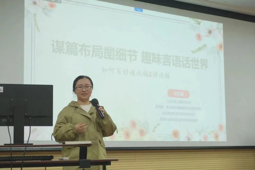 化学与材料科学学院实习辅导员许芯蕾老师带来培训班第二讲:谋篇布局凿细节,趣味言语话世界。她根据自身丰富的工作经验与扎实的文字功底,围绕通讯稿的写作原则、类型特点和写作技巧展开分享,系统介绍了通讯稿撰写的基本要点,进一步加深了同学们对文案撰写的认识。