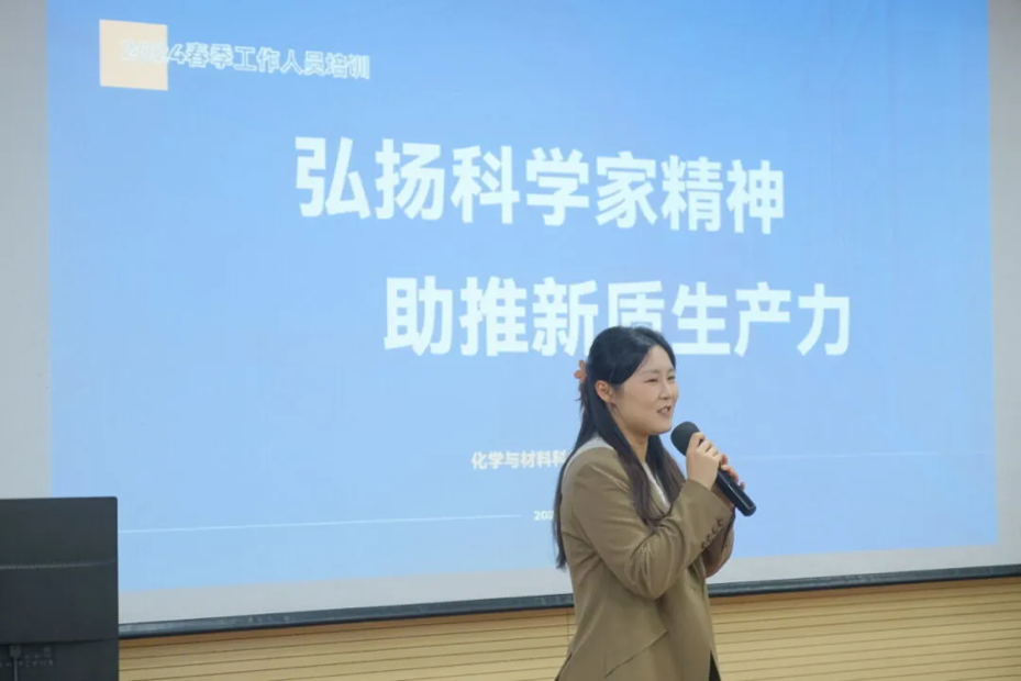 化学与材料科学学院团委书记杨浩老师带来开班第一课:弘扬科学家精神,助推新质生产力。她结合老一辈科学家的故事实例,深刻阐释了中国科学家精神的时代内涵,勉励同学们要传承和弘扬“爱国、创新、求实、奉献、协同、育人”的科学家精神,积极领会新质生产力理论意蕴,增强创新引领意识,在实践中不断提升专业能力与综合素质。