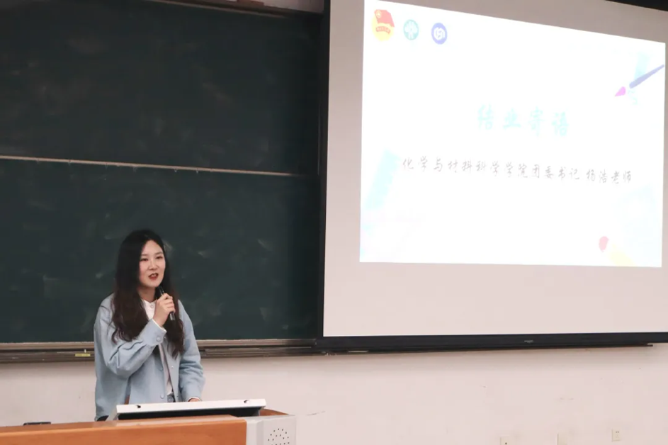 化学与材料科学学院团委书记杨浩老师为本次培训做结业寄语。她向学生骨干们提出了三点期望:一是提高队伍素养,政治方面更加坚定;二是用心总结学习,服务同学更加聚焦;三是坚持立破并举,组织改革更加深化。希望同学们将此次培训作为新的起点、新的动力,在各自岗位上更好地锤炼自己、提升自己,实现团学组织和自我的双向成长。