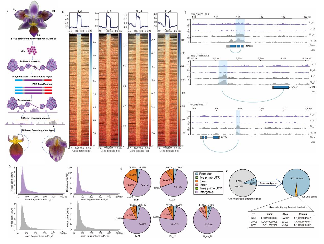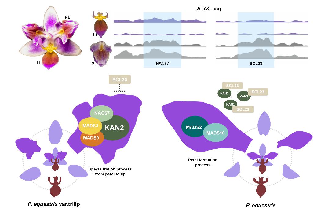 本研究以单唇瓣小兰屿蝴蝶兰、三唇瓣小兰屿蝴蝶兰为实验材料,从两个材料中特化的唇瓣、唇状花瓣、花瓣出发利用染色质可及性测序技术(ATAC-seq)在三唇瓣小兰屿中挖掘到唇状花瓣特化发育的关键转录因子——PeSCL23和PeNAC67。