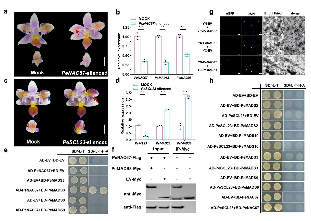 为验证PeNAC67和PeSCL23的功能,本研究利用病毒沉默体系下调了两者在三唇瓣小兰屿蝴蝶兰中的表达量。结果发现,PeNAC67沉默株系唇状花瓣上出现唇瓣特征退化的表型,PeSCL23沉默株系花瓣则出现了唇瓣特征加强的趋势。并PeNAC67和已报道调控唇瓣的B类MADS-box家族的PeMADS3存在相互作用。