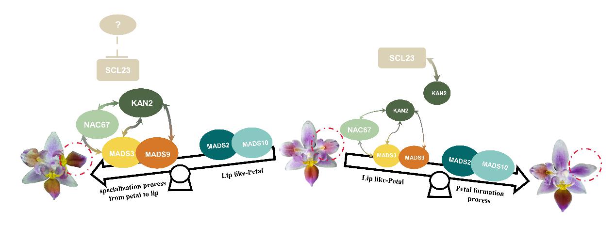 结合多方面的实验证据,本研究推测在小兰屿的唇瓣发育过程中,PeKAN2协同PeNAC67和两个B类MADS-box家族基因促进了花瓣向唇瓣的特化过程,在此过程中PeSCL23可能受到未知因素的抑制;当其抑制被解除时,PeSCL23通过对PeKAN2竞争性结合,导致PeKAN2对B类MADS-box家族基因的结合能力变弱。这样的结果可能让形成花被片复合物的MADS2/MADS10表达加强,从而调控唇瓣向花瓣特征方向发育。