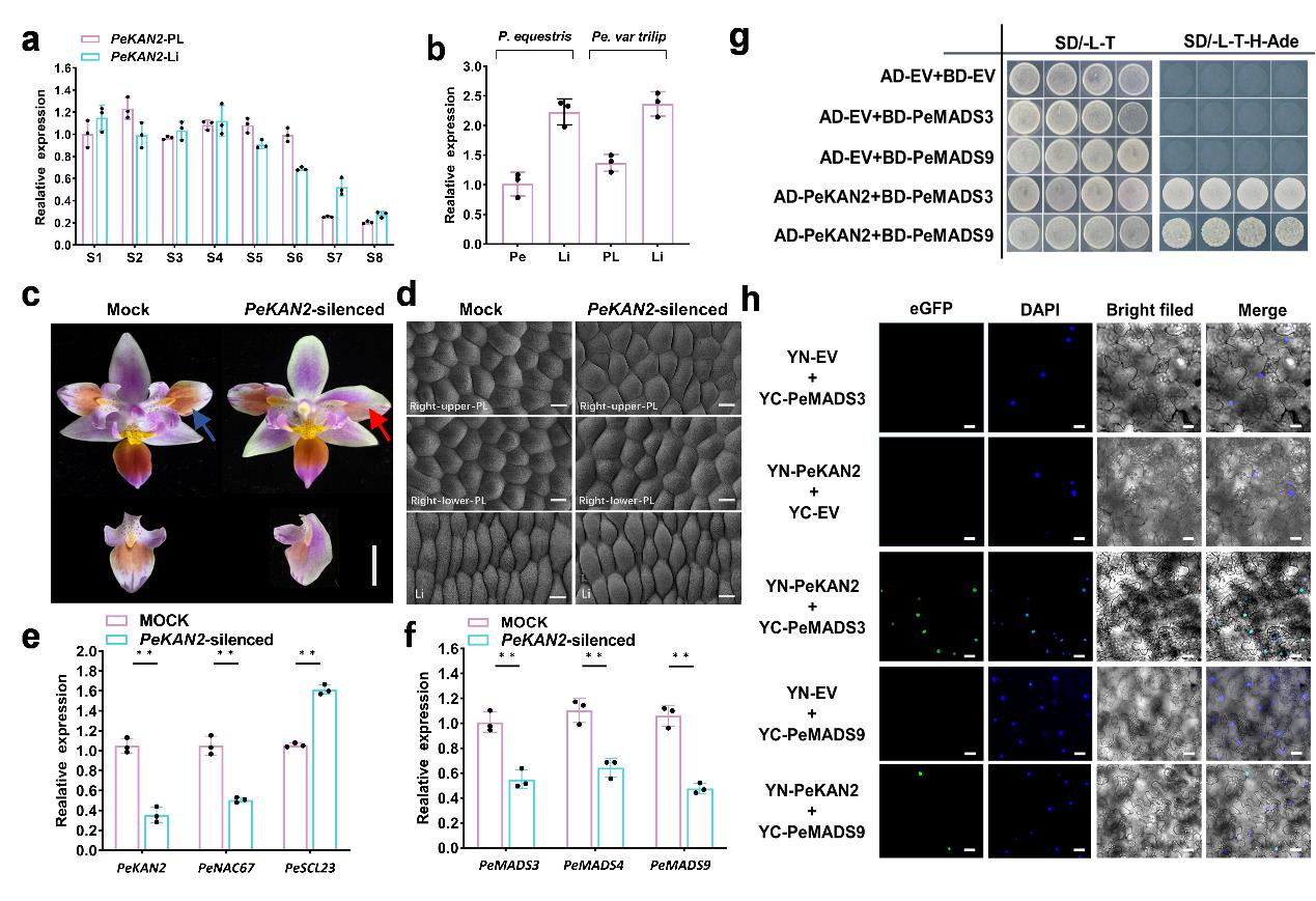 本研究进一步通过RNA-seq技术,发现唇瓣、唇状花瓣、花瓣中的一个差异表达基因PeKAN2。对PeKAN2下调表达量后出现了与PeNAC67沉默株系中唇状花瓣的近似形态。通过Y2H、Co-IP、BiFC等实验,证明了PeKAN2和PeNAC67、PeSCL23在蛋白水平上存在相互作用,并且它与已报调控唇瓣发育MADS3和MADS9也能够发生互作。说明PeKAN2可能在唇瓣特征的特化发育中扮演着重要的角色。