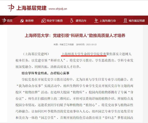 10月15日,上海基层党建网以“ok138太阳集团:党建引领“科研育人”助推高质量人才培养”为题,首页专题报道了我院以党建引领“科研育人”,助推高质量人才培养的相关举措。