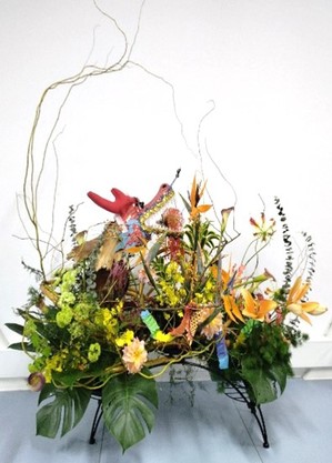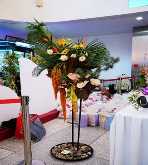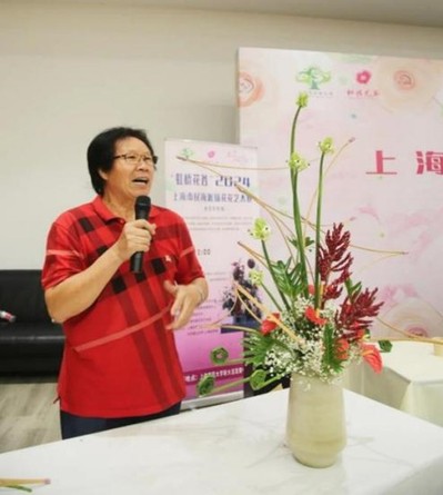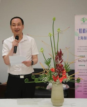 首批中国插花花艺大师王路昌在现场表演,完美地形成了虚实结合、花影扶苏、风姿绰约、具有海派花艺的代表作品,既有中国传统插花的造型特点,又有西式插花艺术的色块感等。