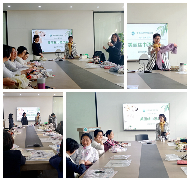 2021年11月3日下午,OK138太阳集团工会“妇女小家”的“美丽丝巾添风采”活动在221会议室如期展开,特别邀请了陈国光老师为女教职工们带来了一场浪漫而又实用的的丝巾讲座。陈老师多年来一直从事装饰艺术的创作、教学活动,并出版了《丝巾魔法秀(百变巧装饰)》等十余本艺术类书籍,将个人艺术造诣融入时尚生活。她将自己研究出来的一系列适合女教职工的职场、休闲、旅游等各种场合的丝巾搭配技巧通过实物教学的方式与在场的女老师们进行了分享。