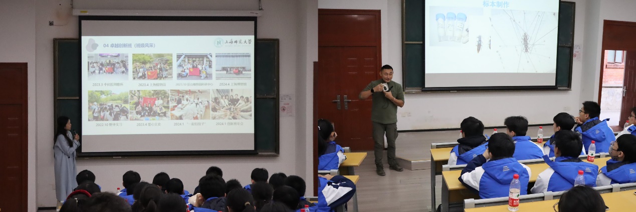 彭中老师向同学们讲述了分类学的相关知识、标本制作的流程,引领同学们走进昆虫世界,激发他们探索自然奥秘的兴趣。同学们在讲座中进一步加深了对上师大生科院、生物专业和科研的了解,为规划自己的人生路打开了一个新的视野。