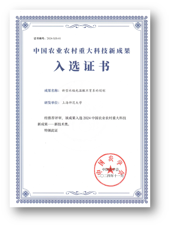 我院杨仲南和朱骏课题组研究成果《新型水稻光温敏不育系的创制》,按照《中国农业农村重大科技新成果遴选办法》(农学(学术)发〔2023〕10号),经形式审查、网络评审、复选、终选等环节,最终入选2024中国农业农村重大科技新成果的农学新技术成果。