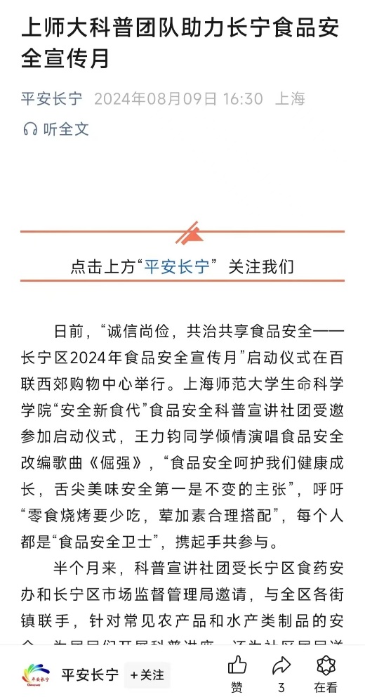 7月10日,“安全新食代”科普宣讲队受邀参加“诚信尚俭,共治共享食品安全——长宁区2024年食品安全宣传月”启动仪式。社团成员王力钧同学倾情演唱食品安全改编歌曲《倔强》,“食品安全呵护我们健康成长,舌尖美味安全第一是不变的主张”,呼吁“零食烧烤要少吃,荤加素合理搭配”,每个人都是“食品安全卫士”,携起手共参与。