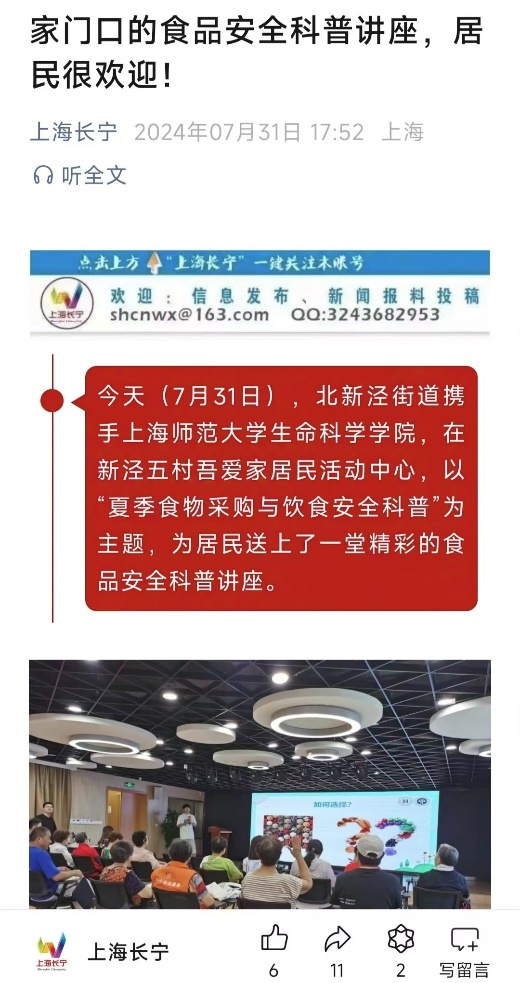随后,社团受长宁区食药安办和长宁区市场监督管理局邀请,与全区各街镇联手,针对常见农产品和水产类制品的安全,为居民们开展科普讲座;还为社区居民送上“夏季食物采购与饮食安全科普”讲座,目标是提升居民食品安全意识,帮助公众树立健康饮食理念,共同构建健康安全的饮食环境。