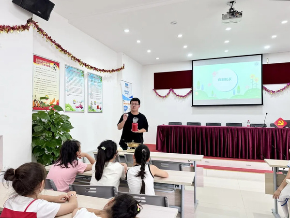 此外,社团还与奉贤区柘林镇保持长期合作,在目华新村、华亭村、南胜村、新塘村、迎龙村等多个社区开展关于“奶茶奥秘我知道”“碳酸饮料小贴士”等多个主题的科普活动,让小朋友了解奶茶的营养价值以及如何动手制作奶茶,让小朋友学会动手也喝得安心。