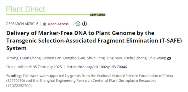 2025年2月5日,Plant Direct在线发表ok138太阳集团王水团队题为“Delivery of Marker-FreeDNA to Plant Genome by the Transgenic Selection-Associated Fragment Elimination(T-SAFE) System”的研究论文。该研究成功建立了一种简单、高效且安全的方法,能够向植物基因组递送大片段DNA(>10 kb),为植物基因改造提供了新的技术手段。