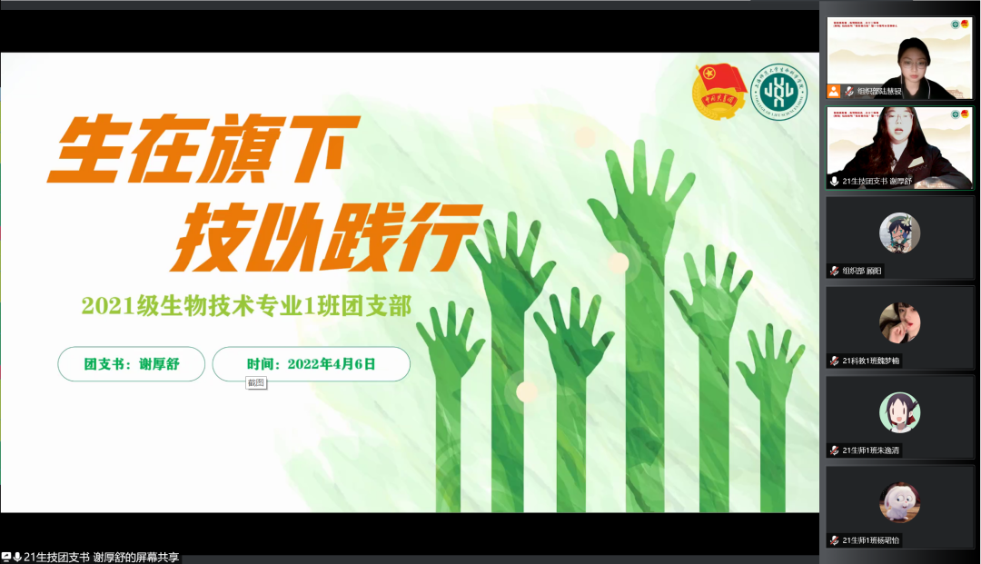2021级生物技术专业1班团支书谢厚舒向大家充分展现了支部活力,支部参与志愿服务的成员队伍不断壮大。支部微视频以诙谐幽默的方式呼吁大家听指挥做核酸,相信同舟共“技”大家一定能共渡难关!