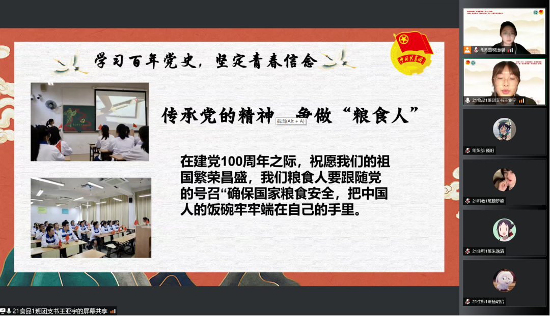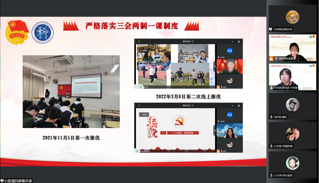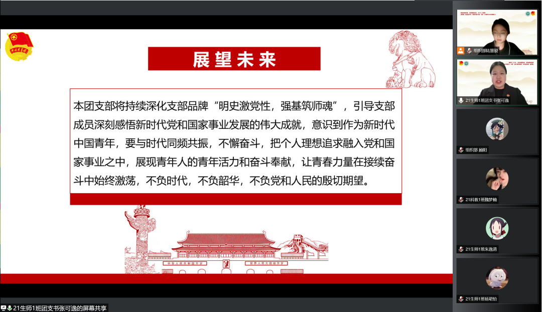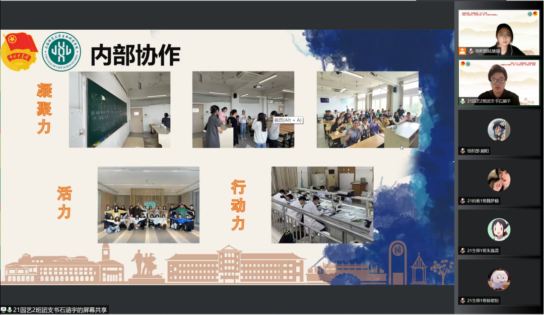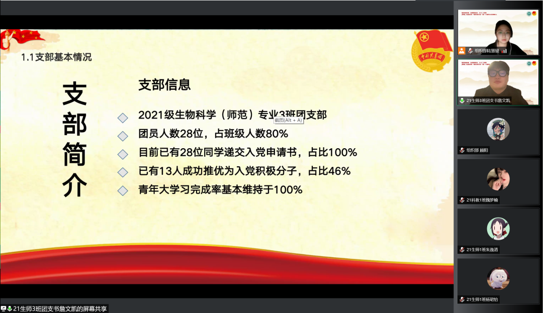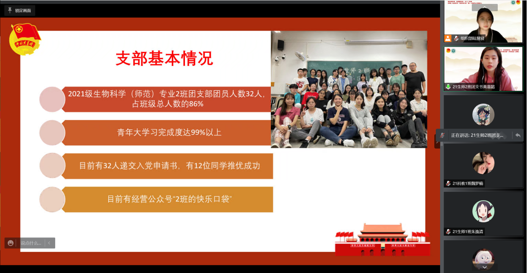 2021级生物科学(师范)专业1班团支书张可逸通过支部建设以及团日活动等方面彰显了支部品牌“明史激党性,强基筑师魂”,并且分享支部成员合唱的《少年中国说》配上疫情期间同学志愿活动的照片,展现了支部成员的青春活力和奉献精神。