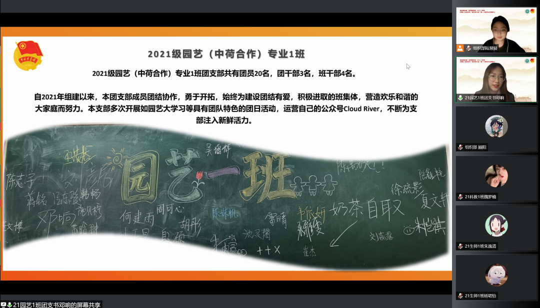 2021级园艺(中荷合作)专业2班团支书石涵宇为大家分享了支部建设的经验与成果,结合专业特色打造支部品牌“花源宝宝”、发扬支部风采。日常工作网格化管理、落实班团一体,尽显支部凝聚力、活力与行动力。由支部制作的抗疫微视频彰显支部创造力、讲述支部的的特色抗疫之路。