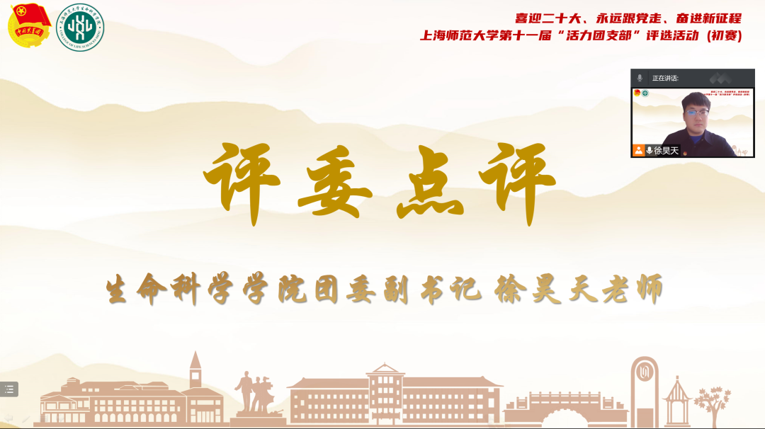 在活动的最后,徐昊天老师对各参赛团支部聚焦主流、立足当下、凸显特色的支部介绍和视频展示予以充分肯定,表示在这场疫情大考下,不论是个人还是集体,成长的脚步不会因校门的关闭而放缓,支部的活力即使在云端演绎也同样值得喝彩。他从“从严从实,夯实基础建设”“求新求变,激发支部活力”“互学互鉴,凝聚青春智慧”三个方面对团支书的未来工作提出建议,希望团支书们能传承百年荣光、发挥聪明才智,打造更加充满活力、更加坚强有力的团支部,让“团结一心、共克时艰”成为生科学子的精神动力,让“请党放心,强国有我”成为当代青年的青春强音。