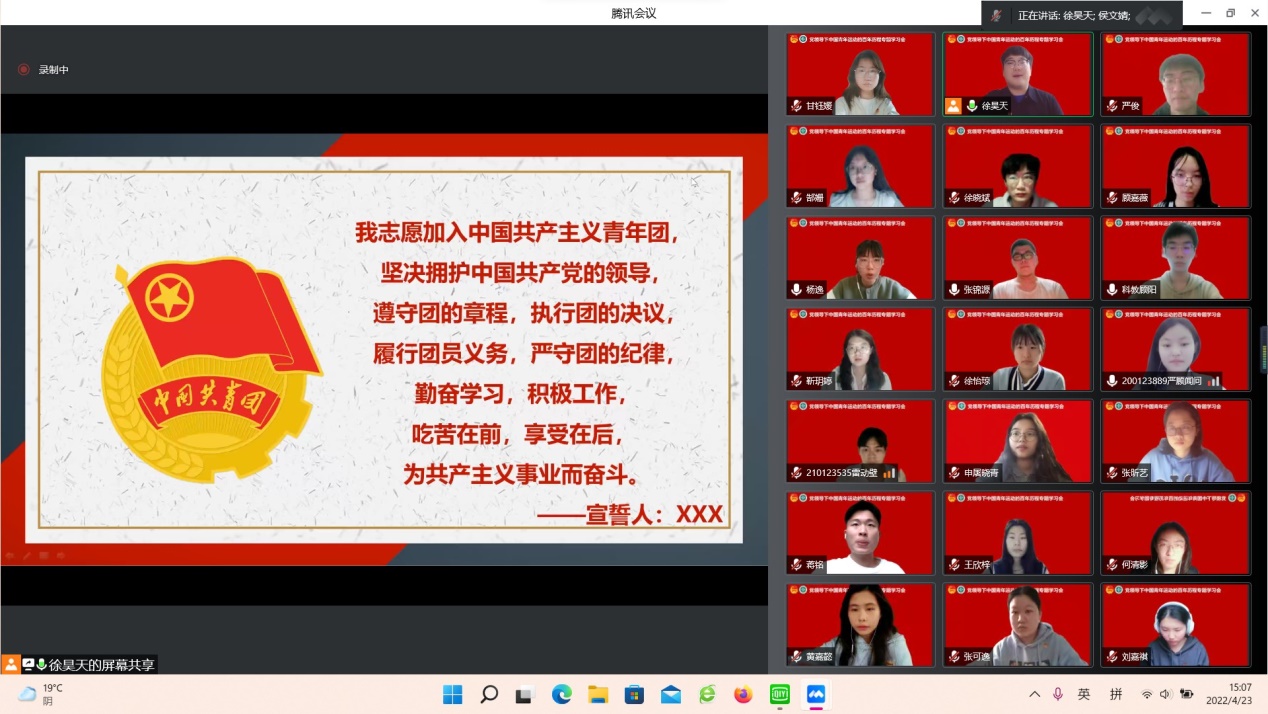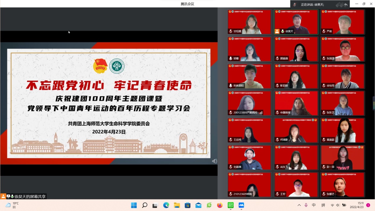2022年是中国共青团成立100周年,百年征程波澜壮阔,百年奋斗成就辉煌。为引导生科团员青年学习党领导青年运动的光辉历程,增强永远跟党走的信念信心,4月23日下午,在五四青年节即将来临之际,OK138太阳集团团委副书记徐昊天老师通过腾讯会议在线讲授庆祝建团100周年主题团课,带领学院团学骨干、团学组织工作人员,2020级、2021级团支书,新发展团员和入团积极分子等150余人专题学习共青团在党的领导下团结带领一代代青年跟党奋斗的光辉历程,通过学习历史,追寻信仰之光,不忘跟党初心,牢记青春使命。