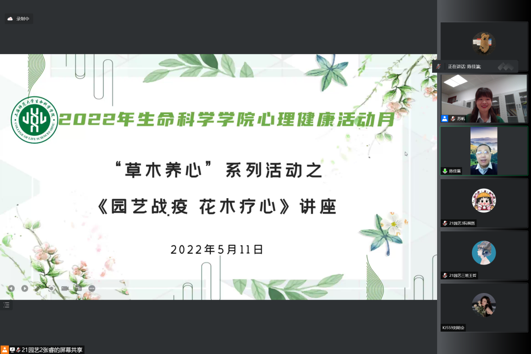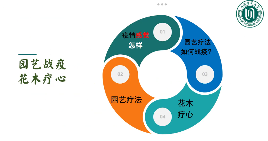 随后,讲座正式进入议程,陈老师主要从疫情感觉怎么样,园艺疗法,园艺疗法如何战疫以及花木疗心这四个板块展开了演讲。