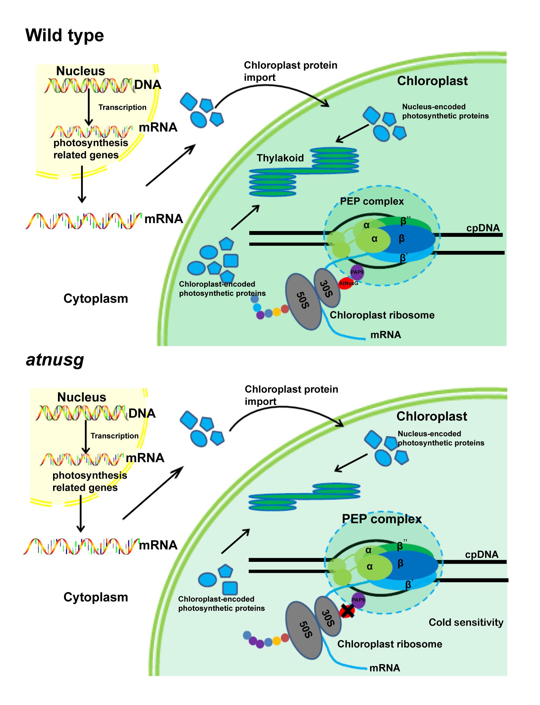 系统进化分析发现,NusG同源蛋白不仅存在于原核生物中,还存在于陆生植物和各种光合藻类中。模式植物拟南芥中的NusG同源蛋白AtNusG,它曾在质体转录活性染色体复合物中被鉴定到,命名为pTAC13。该研究发现,AtNusG定位于叶绿体类核且分别同叶绿体中细菌起源的RNA聚合酶和核糖体共迁移。进一步分析发现,AtNusG并不是同PEP复合物的核心亚基互作而是通过与叶绿体PEP复合物必需成分PAP9相互作用同其相联系,它还通过与叶绿体核糖体两个组分PRPS5和PRPS10相互作用同叶绿体核糖体相联系。这些结果表明,叶绿体的转录和翻译存在偶联。研究发现,在正常培养条件下,AtNusG缺失突变体同野生型的表型相似,不过,其新生叶片的PSⅡ最大光化学量子产率较野生型低。然而,在低温胁迫下,AtNusG缺失突变体的新生叶片表现出明显的黄化表型,叶绿体的发育受阻。在正常培养条件下,AtNusG缺失突变体新生叶片中光合复合物的积累较野生型相比略有减少。转录组分析显示,叶绿体编码的光合基因如psbA、psbB、psbC和psbD的转录本积累没有明显变化。免疫印迹分析则表明,它们所编码的蛋白的积累量则明显降低。在正常培养条件下,AtNusG缺失并没有影响叶绿体核糖体的生物发生;但是,叶绿体多聚核糖体分析结果表明,AtNusG的缺失影响了这些蛋白质的翻译,这可能导致该突变体的光合效率显著降低以及对低温胁迫的敏感性增强。该研究表明,细菌中NusG介导的转录-翻译偶联机制在叶绿体进化过程中得以保留,不过,叶绿体中AtNusG同聚合酶相偶联的具体亚基已发生改变;AtNusG介导的转录和翻译之间的偶联促进叶绿体编码的一些光合基因的表达,从而确保了植物早期光合能力的快速建立以及对外界环境变化的响应。该研究揭示了高等植物叶绿体基因表达调控的新机制,丰富了人们对高等植物叶绿体基因表达调控的认识。