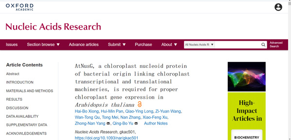 E. coli转录因子NusG分别同RNAP的核心亚基β'和核糖体组分NusE/RPS10互作介导转录与翻译过程的偶联。2022年6月23日,我院余庆波课题组在国际著名学术杂志Nucleic Acids Research (影响因子16.971)在线发表了题为“AtNusG, a Chloroplast Nucleoid Protein of Bacterial Origin Linking Chloroplast Transcriptional and Translational Machineries, is Required for Proper Chloroplast Gene Expression in Arabidopsis thaliana”研究论文,该研究报道了模式植物拟南芥NusG的同源蛋白通过偶联叶绿体转录机器和翻译机器调控叶绿体基因表达的分子机制。