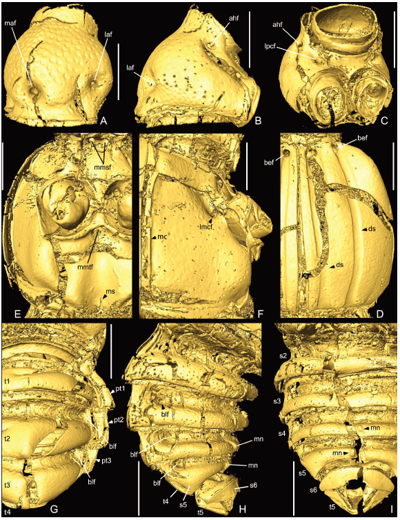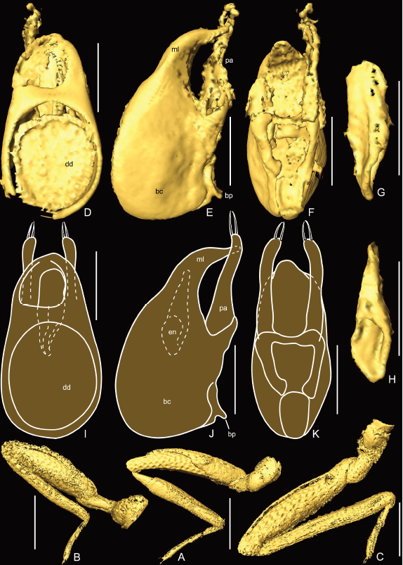 论文还利用显微扫描(Micro-CT)的方法,对化石的内外形态结构开展了重点研究,重建了虫体窝系统、头部内骨骼和雄性生殖器等重要特征,为化石的形态演化分析和系统发育特征提取提供了详实的数据。
