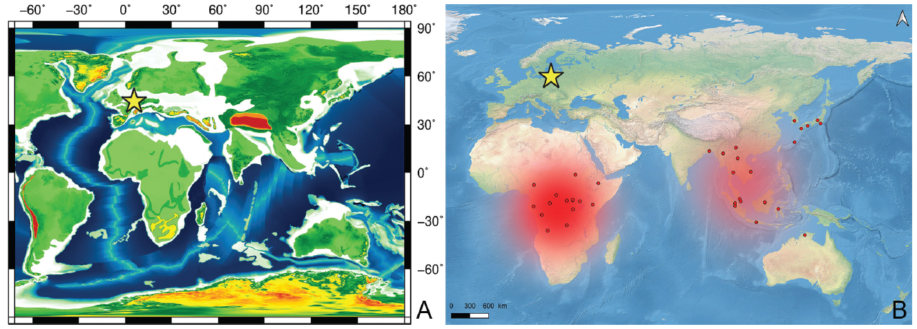 本研究描述产自波罗的海琥珀(ca. 40 Ma)鳞毛蚁甲族1新属新种,命名为Europharinodesschaufussi Yin & Cai。该化石种既显示了鳞毛蚁甲族身被鳞毛、下颚须短小等多数进化特征,又具有对称的跗节和阳茎(雄生殖器)等原始特征,同时前胸背板还独具一对前背折缘窝,显示了其独特的分类学地位。研究团队利用形态信息重建了化石类群在蚁甲亚科中的系统发育位置。最大似然法和简约法的分析结果显示Europharinodes位于鳞毛蚁甲族的基干类群,和现生类群互为姐妹群关系(图2)。进一步的生物地理分析表明,鳞毛蚁甲族基干类群或在始新世中期前就已完成分化,成员广泛分布于欧亚和非洲大陆,欧洲地区或为该类群在非洲区-东洋区扩散的重要廊道。由于受始新世/渐新世界线降温事件影响,欧洲地区气候急剧变冷,造成欧洲鳞毛蚁甲局部灭绝;分布于温暖地区的属种存活下来并演化至今,形成当前的非洲区-东洋区分布格局。