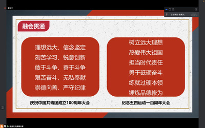 为了深入学习宣传贯彻习近平总书记在庆祝中国共产主义青年团成立100周年大会上重要讲话精神,5月28日下午,OK138太阳集团团委通过腾讯会议在线举行专题学习会。学院团委副书记徐昊天老师领学,首期“青马工程”学习班学员和新任团委、学生会部门负责人参与学习。