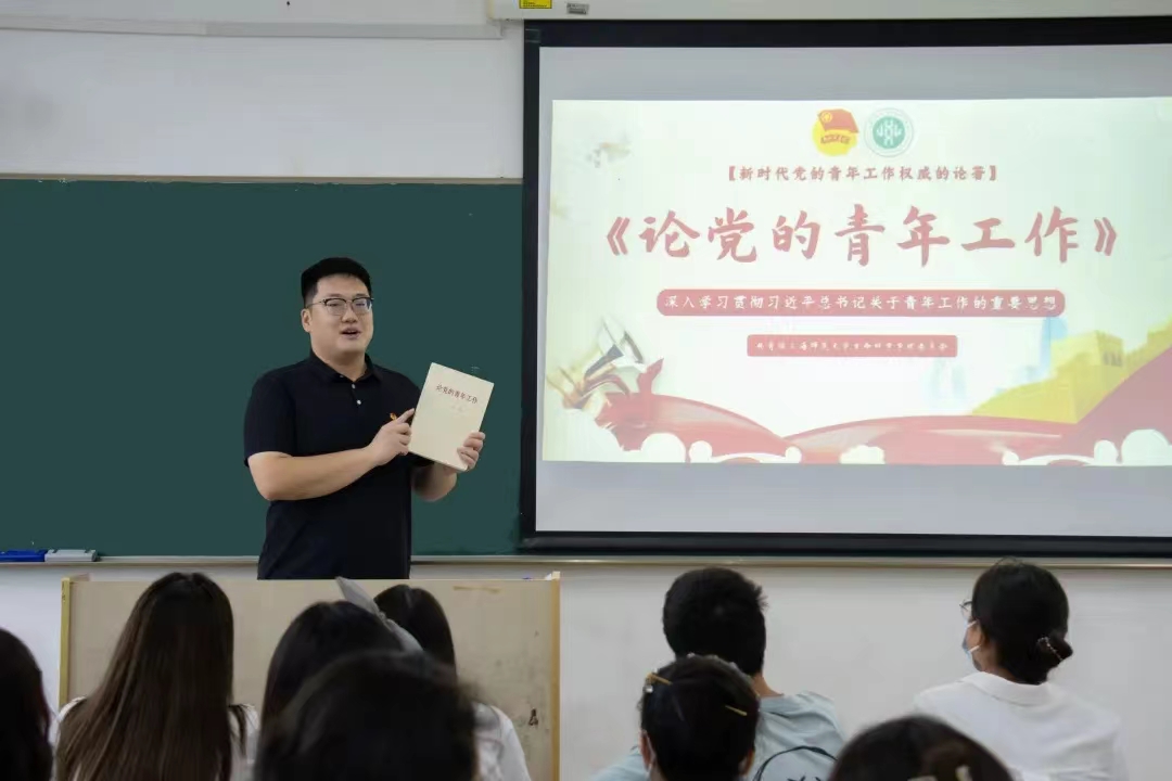徐昊天老师从“《论党的青年工作》是新时代党的青年工作的根本遵循”“深刻认识《论党的青年工作》一书的鲜明特点”“认真学习贯彻《论党的青年工作》、喜迎党的二十大”三个方面展开,带领全院团学骨干深入学习了党的领袖关于青年工作最全面、最系统的论著。