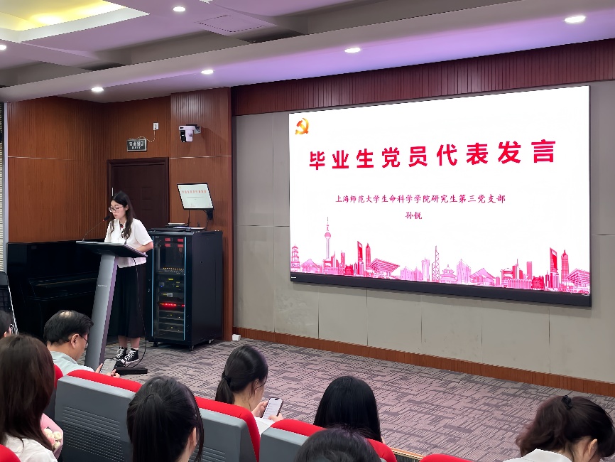 活动在优秀毕业生党员代表、植物学专业研究生孙锐的发言中拉开帷幕。她以“追光而遇,沐光前行”为主线分享成长经历。她曾任研究生党支部书记,搭建党团桥梁,以“传帮带”机制助力师弟师妹成长;投身科研实践参与多项生物多样性调研项目,发表3篇学术论文并获国家奖学金。即将踏上讲台的她,表示将以“四有”好老师为目标,在教师岗位上延续党员的奉献精神,展现青年党员“追光、成光、散光”的担当风貌。