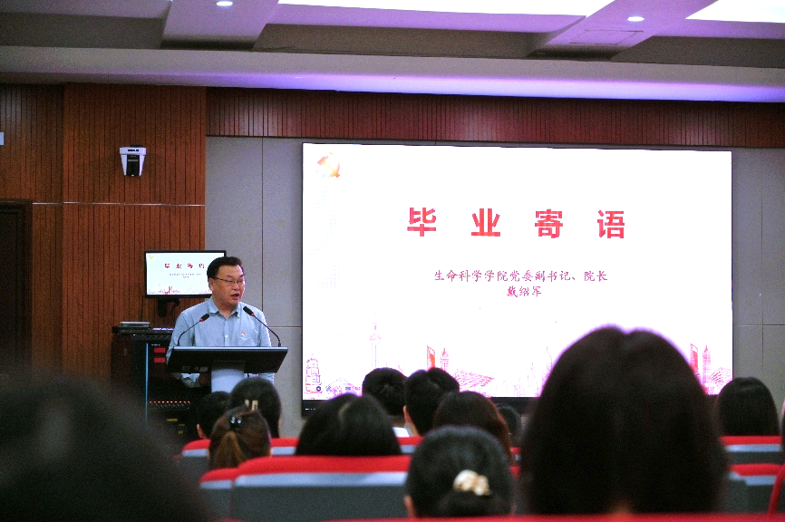 学院党委副书记、院长戴绍军在毕业寄语中对毕业生提出三点希望:一要坚定理想信念,将生命科学研究与国家战略结合,以信仰支撑科研与民生服务;二要锤炼过硬本领,保持求知精神,在基因编辑、教育教学等领域勇攀高峰;三要勇担社会责任,把个人理想融入党和国家事业,关注人民需求、服务奉献社会。他强调毕业是新起点,希望同学们以党员标准严格要求自己,学院永远是同学们的坚强后盾,欢迎大家常回“家”看看。