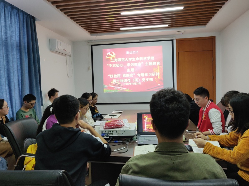 2019年10月23日14:00,微生物遗传(研)党支部组织全体党员在14号楼实验中心901会议室开展“对照党章党规找差距”专题主题党日活动。