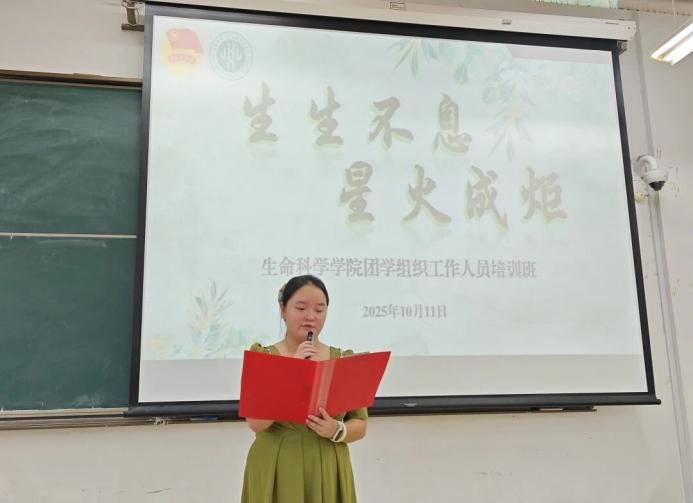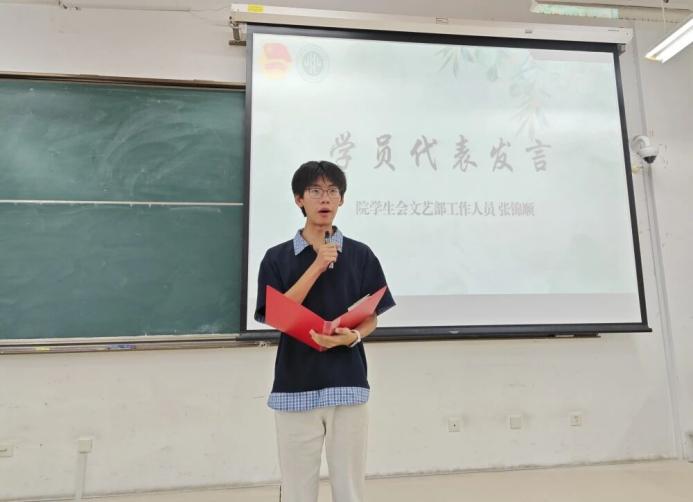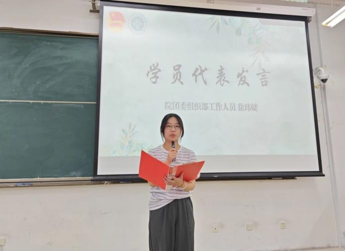 随后,院团委组织部工作人员徐玮婕作为学员代表发言。她认为,此次培训为团学组织工作人员提供了系统学习和全面提升的机会,能够强化角色认知与责任担当,帮助明确自身定位,提升执行力与思想觉悟,呼吁大家以饱满热情投入工作,勇于接受挑战,团结协作,共同成长,并以实际行动贯彻学习成果。