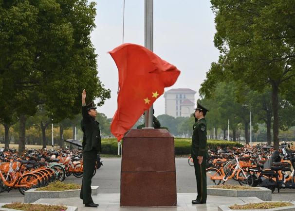 伴着庄严激昂的国歌声,鲜艳的五星红旗徐徐升起,全体师生肃立行注目礼,胸中激荡着对祖国的热爱与崇高敬意。